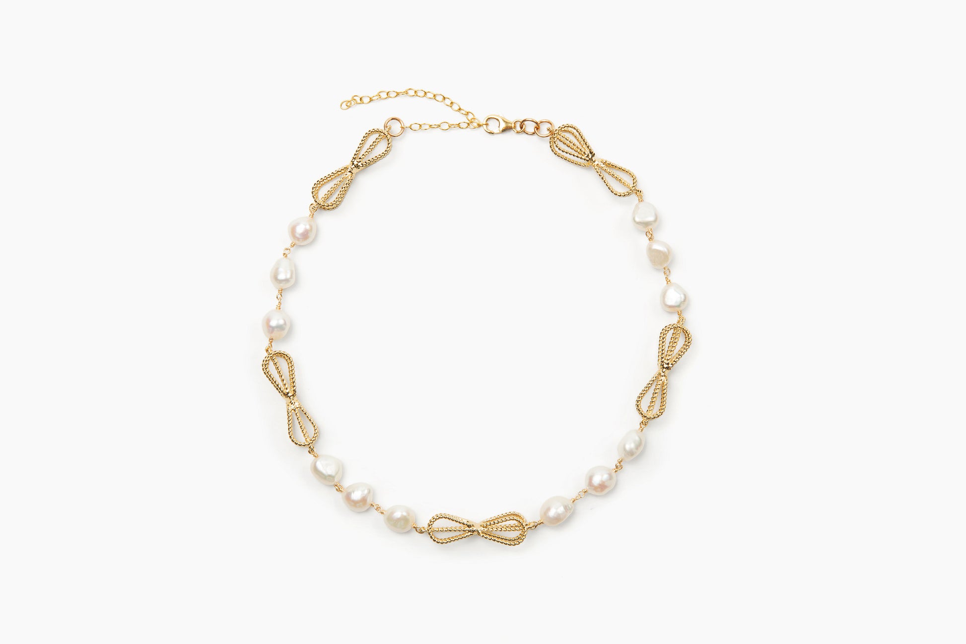 - Bow link chain plated in 14K gold combined with Fresh Water Pearls