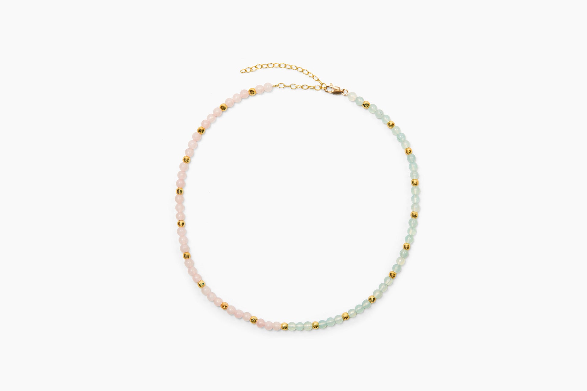 - Blue aquamarine and Rose quartz combined with 14K gold plated beads
